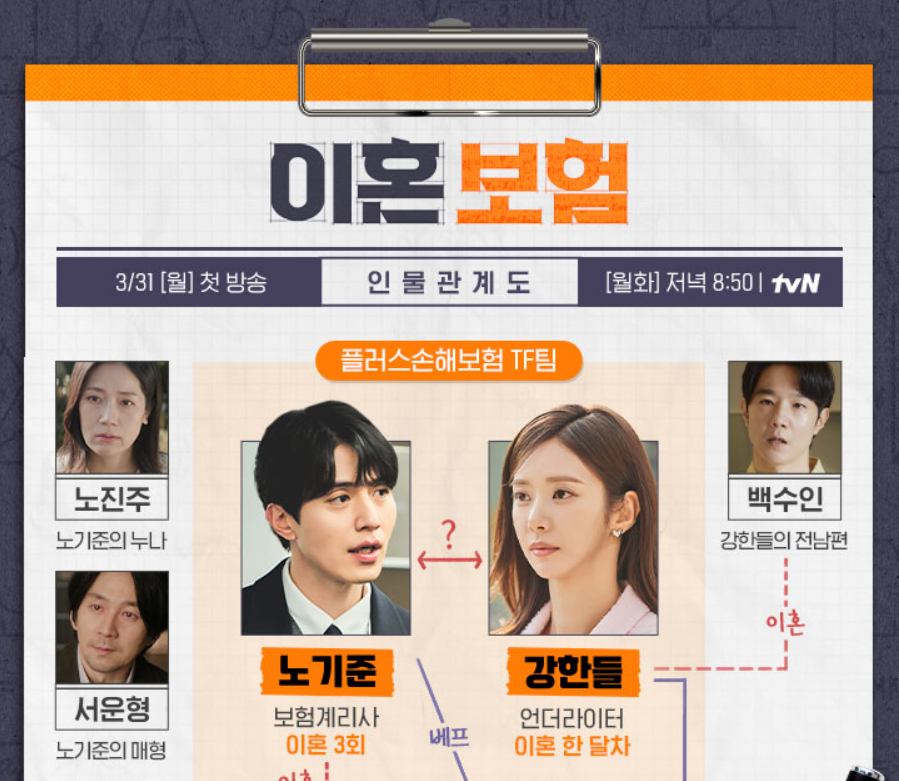 25.03.31에 방영을 시작할 드라마 이혼보험은 독특한 보험 상품을 개발하는 과정을 그린 로맨틱 코미디 드라마입니다. 이혼을 경험한 다양한 인물들이 보험 상품을 기획하면서 겪는 갈등과 성장, 그리고 예상치 못한 로맨스를 중점으로 이야기가 진행됩니다.