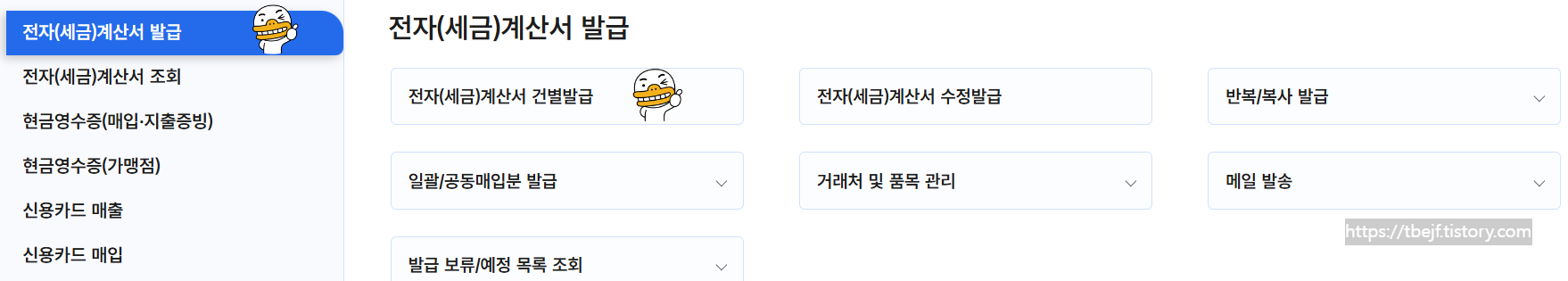 ● [전자세금계산서, 현금영수증, 신용카드] > [세금계산서 발급] > [전자세금계산서 건별발급] 메뉴를 눌러주시길 바랍니다.