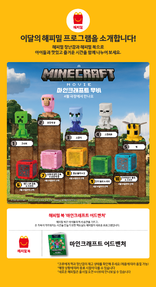 맥도날드에서 마인크래프트 무비 해피밀을 2025년 4월 3일부터 출시를 시작하였습니다.